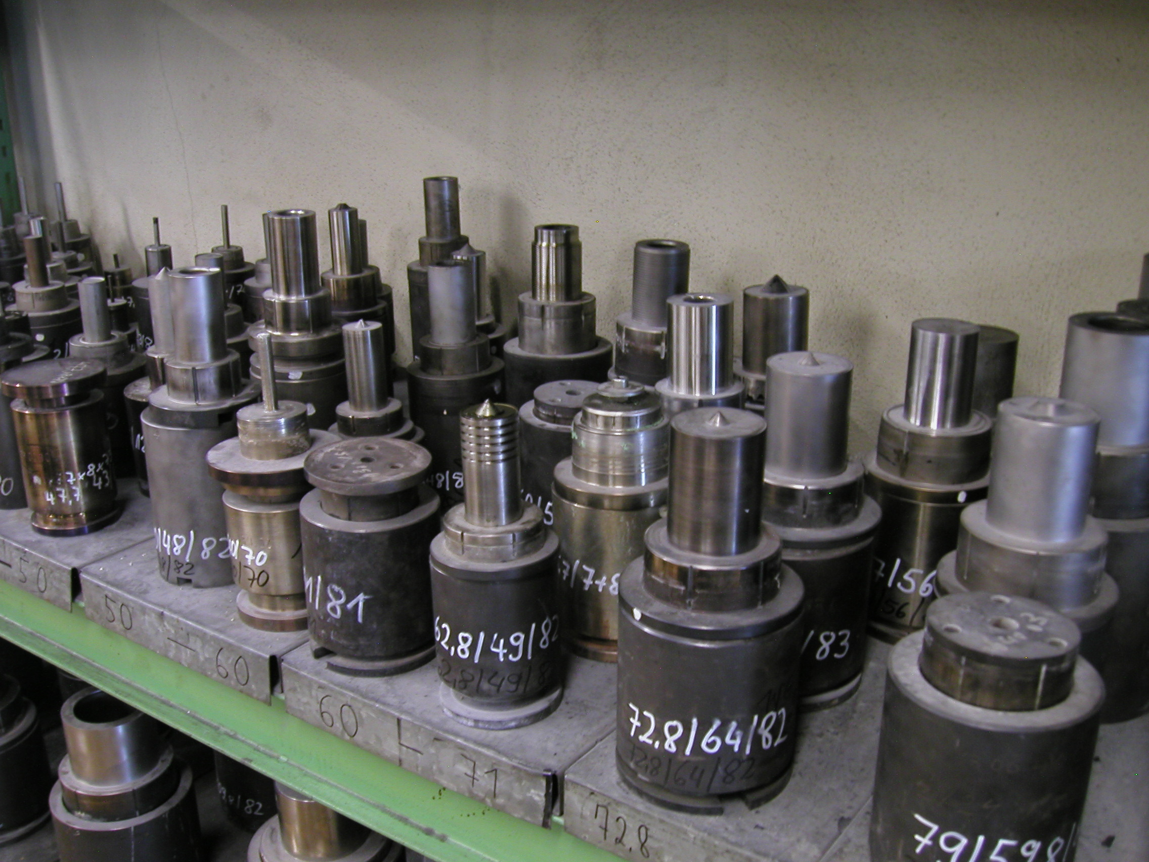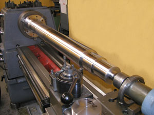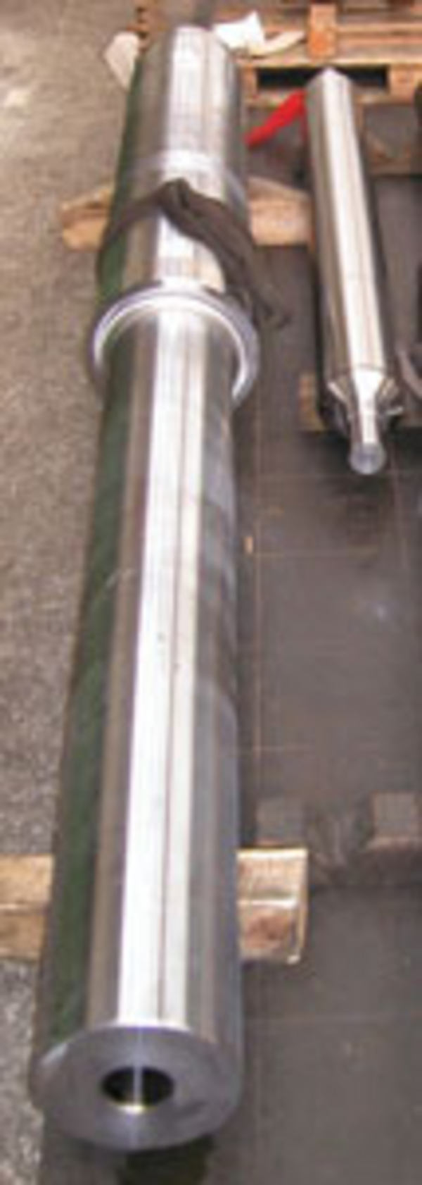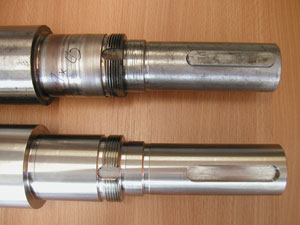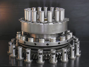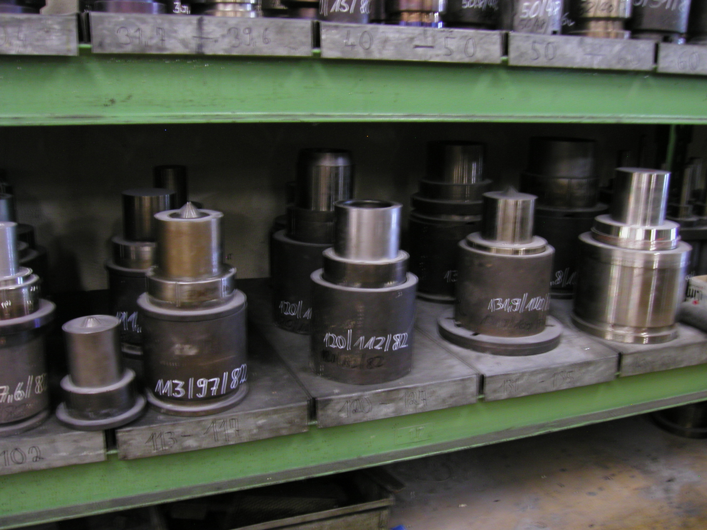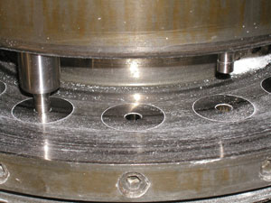 Anfertigung der Buchsen (inkl. Härten und Schleifen) und Verschraubungen sowie Aufspindeln aller verschlissenen Bohrungen des Rundtisches von oben und unten, so dass beide Kolben (oben und unten) wieder exakt auf einer Achse liegen und im Hundertstel-Bereich aufeinander treffen. Hierzu wurde jede Bohrung einzeln mittels Zentrifugator aufgenommen. Jede Kolbenführungsbuchse wurde von Hand passgenau eingeschliffen. Der Mitteltisch überdreht und poliert, anschließend von Hand mit Läpp-Mittel und Diamantpaste auf Hochglanz gebracht.